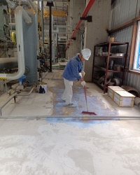 3 用KETCH419系統(tǒng)專利環(huán)氧清漆按比例加入高精度石英砂混合攪拌均勻,倒于地上,按甲方要求厚度刮平做地坪中層,以增強(qiáng)地坪抗沖擊、抗壓、抗腐蝕等性能保證地坪的經(jīng)久耐用; 打磨吸塵,清潔表面顆粒;